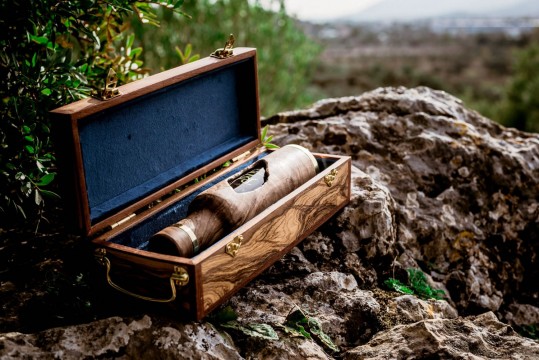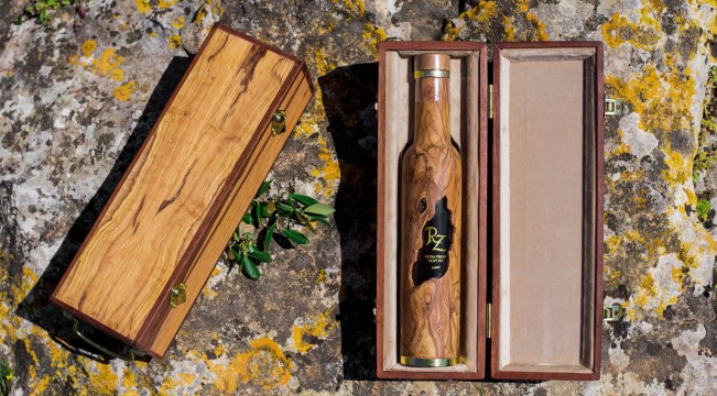 Ξύλο ελιάς, ορείχαλκος και βελούδο σε 4 χρώματα (βαθύ μπλε, πορφυρό, μπεζ-κρεμ και λαδί σκούρο) για να συνδυάσουμε όσο καλύτερα μπορούμε τη συσκευασία δώρου με το ξύλινο μπουκάλι. Έτσι δημιουργήσαμε το απόλυτο -διαφορετικό- δώρο/εταιρικό δώρο.